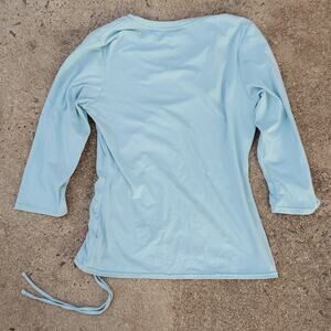 stretchy top. Shirring with drawstring on one side. 3/4 sleeves. Scoop neck. Straight hem.