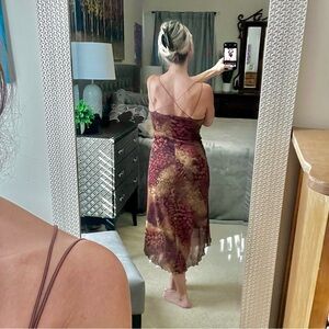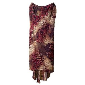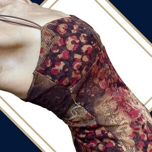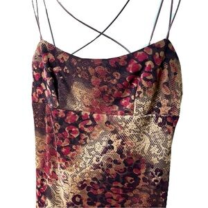 Jodi Kristopher sexy High-Low Dress with built-in slip, double elastic spaghetti straps and Strappy, open Back. Lightweight, Stretchy, Form Fitting fabric in a brown and crimson leopard print and cream lace print. Size S in excellent condition.