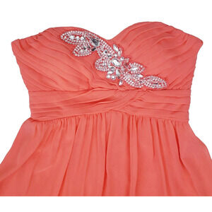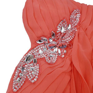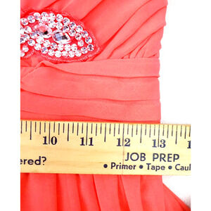 This stunning Jodi Kristopher dress is perfect for any formal occasion. The coral color and beaded rhinestone accents make it a true standout piece. The fit and flare style and halter neckline add a touch of elegance, while the sheer features and strapless sleeves give it a sexy edge. The dress is made of a combination of polyester, nylon, and cotton materials with a zip closure. It is a size 7 and should be dry cleaned only. The dress is perfect for a wedding, party, cocktail, or any formal event. Add some glamour to your wardrobe with this designer piece that is sure to make you feel like a princess.