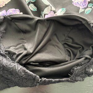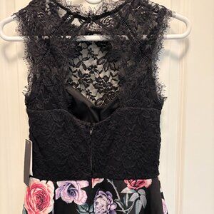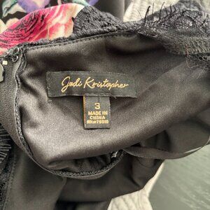 Jodi Kristopher lace top fit and flare dress. Built in black bra under the lace top. Keyhole in back with one snap at neck. Bottom skirt is polyester. Lace top is a blend of polyester, nylon, spandex blend. Approx. measurements: pit to pit 15", waist across front 12.5", shoulder to waist 15.5", shoulder to bottom hem 34". New with tags.