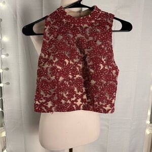 This stylish tank top by Jodi Kristopher features a rich red color with intricate lace embellishments, a sleeveless design, and a chic mandarin collar. The cropped style adds a modern touch, making it perfect for warm-weather outings.