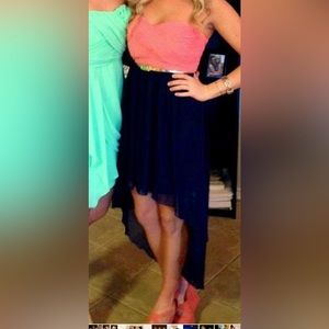 Ruched coral sweetheart neckline with high-low navy blue lower portion features a gold belt (can easily be removed).