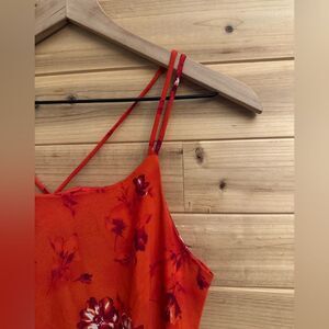 Orangey Red Floral Print Spaghetti Strap Tank Dress With Crissocross Lace Up Tie Back. Labeled As A Size 7/8 Measures Like A Small