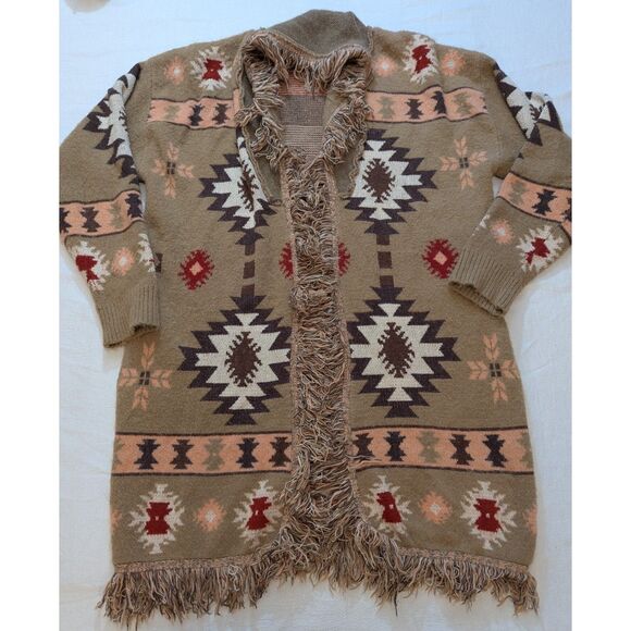 Soft and statement-making! Jodifl open-front cardigan in a taupe base with cream/rust/brown geometric Southwestern pattern and fringe trim at front and hem. Longline duster length for easy layering. Tag size 1X. Fabric: 42% acrylic / 30% polyester / 28% nylon (warm but not itchy). Approx. 22" pit-to-pit, 34" length. Great for boho, cottage, and Western-inspired outfits. Preowned; review photos for overall condition—ready to wear!