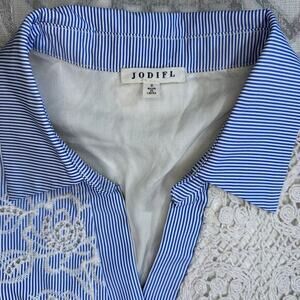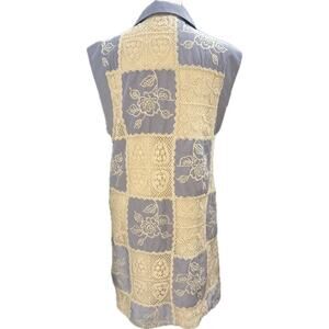 The image shows a dress with a patchwork design, featuring alternating squares of blue and white striped fabric and cream-colored lace. The dress appears to be sleeveless and has a collared neckline. The overall style suggests a bohemian or vintage-inspired aesthetic. The label "jodifl" is mentioned in the prompt, possibly indicating the brand or designer of the dress. Pre owned with pockets good condition. No care tag it feels like cotton. Brand: Jodifl