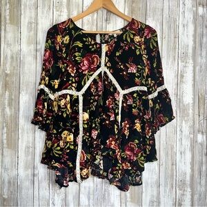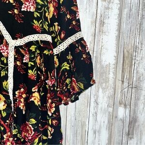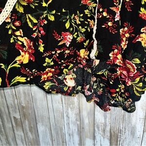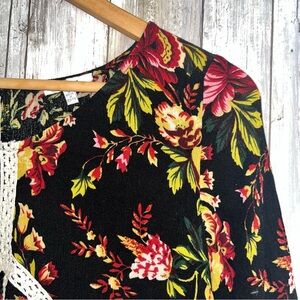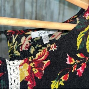 Jodifl Dark Floral Blouse •S Pit: 18.5” Length: 24” •100% Rayon •Gently Used Elegant women's top featuring a vibrant floral design on a black background. Perfect for adding a touch of sophistication to any outfit.