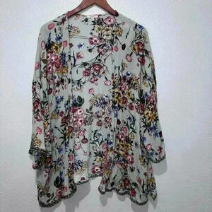 This is a floral print kimono by the brand Jodifl. It is size M and made of 100% rayon. The kimono is in pre-owned condition.