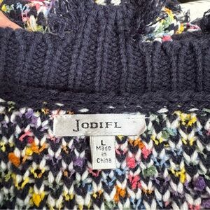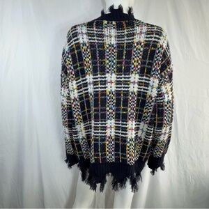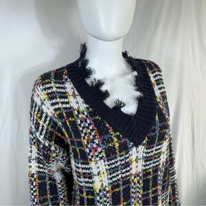 Jodifl Multicolor Knit Plaid Fringe Edge V-Neck Oversized Sweater