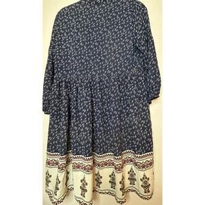 Jodifl Navy Patterned Dress Bib Front, Puff Sleeves, V-Neck Size M Boho Floral