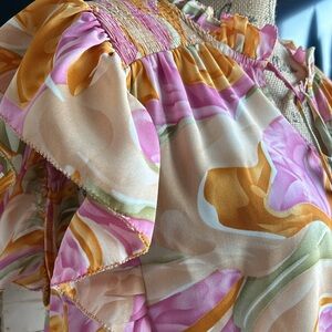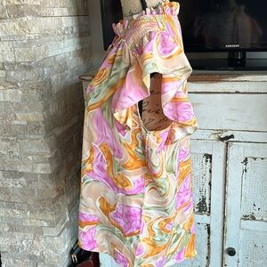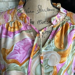NWT Jodifl pink and orange and green swirl pattern top blouse with ruffle short sleeves and tassel tie. Slightly oversized.