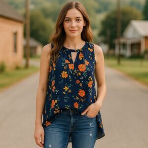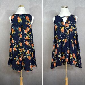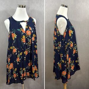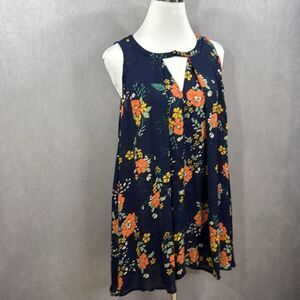 Jodifl Navy Blue Floral Short Sleeveless Tunic Dress Small keyhole Neck Boho