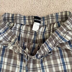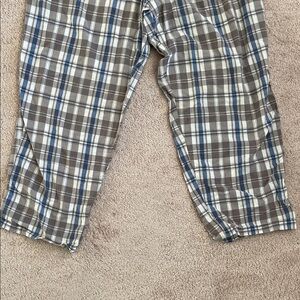 Stylish checkered lounge pants. Features brown and blue pattern. Perfect for relaxing.