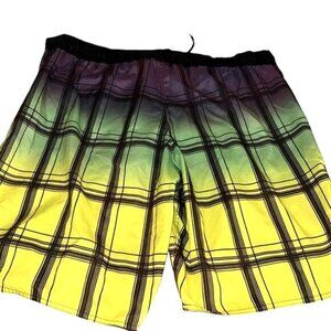 Crafted with quick-drying polyester, these Joe Boxer swim trunks feature a vibrant plaid design that transitions from purple to yellow. The elastic waistband with drawstring closure ensures a secure fit, while the side pocket provides practical storage. Ideal for beach outings and poolside relaxation.