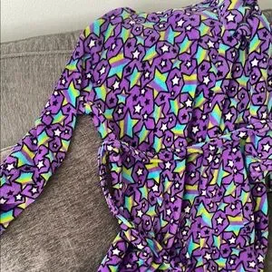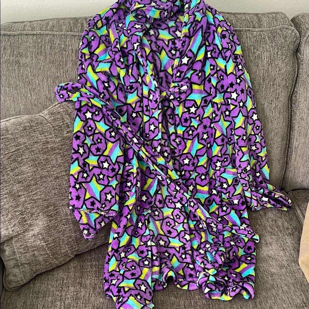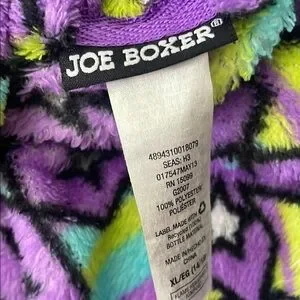 Joe boxer robe with a vibrant star pattern. Features purple, green, blue, and yellow colors. Perfect for cozy lounging. Soft fleece material.