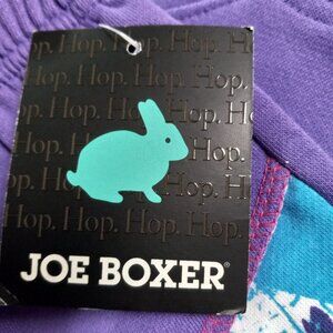 • Joe Boxer graphic sweat pants in shades of pink, blue, green and red on a purple background.
