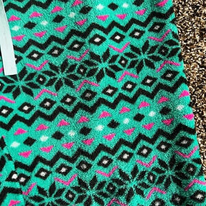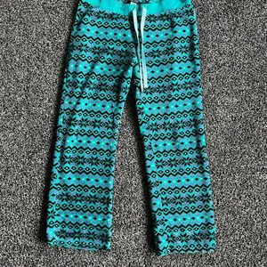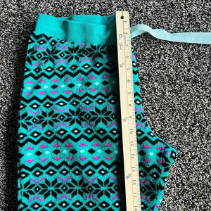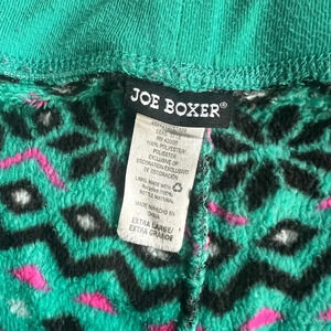 Joe Boxer fleece pants, size XL. Color green with black, pink and white geometric pattern. In good condition, no rips tears or stains. Elastic waistband with drawstring. 100% polyester