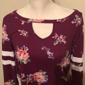 Joe Boxer maroon floral t shirt with front peek a boo opening. Extra large . Sporty stripe around the long sleeves. Stretch poly and spandex fabric . Excellent condition