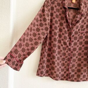 Joe Fresh 100% Silk Red Brown Blouse Button Down Womens Blouse Artsy 70s Retro