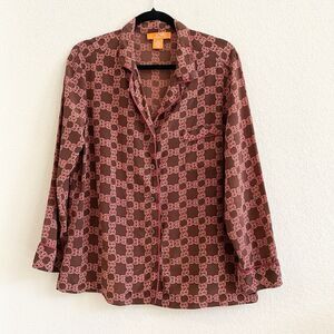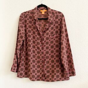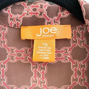 Joe Fresh 100% Silk Red Brown Blouse Button Down Womens Blouse Artsy 70s Retro L