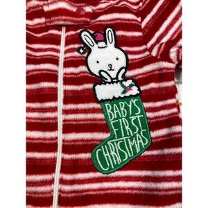 Celebrate a special holiday milestone with this cozy and adorable “Baby’s First Christmas” sleeper from Joe Fresh. Made from soft and warm 100% polyester fleece, this red and white striped footed one-piece features a sweet bunny-in-a-stocking applique and easy zip-front closure for quick changes. Perfect for holiday photos, cozy nights, and festive family celebrations.