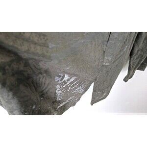 Black stretchy lightweight fabric with abstract floral burnout design. Tapered sleeves.Back has yoke with center pleat below seam. Flat front with no darts.