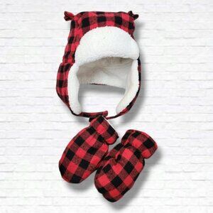 Joe Fresh Boys Red Buffalo Plaid Winter Trappers Hat and Mittens Size 12-24 M
