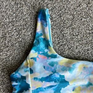This NWT sports bra has removable bass in the bust. The straps are asymmetrical and different widths. It has a fun watercolor pattern in blue, yellow, purple, and pink.