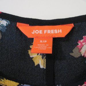 Joe Fresh sleeveless navy floral top with ruffle peplum in S/P. Lightweight crepe 98% polyester 2% spandex. Floral pattern in light blue, yellow, teal, grey, pink and white.Slight gather at scoop neckline. Chest 19.5" across, length 25". No holes or stains.