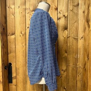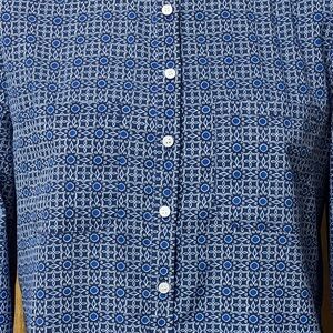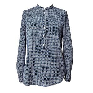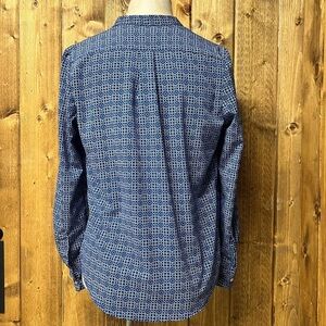 Cute and comfy Joe Fresh blouse in navy blue, white, and light blue geometric design. It buttons halfway up the front with buttons at the wrists. There’s a single chest pocket on the left side for a laid-back touch.