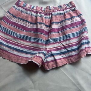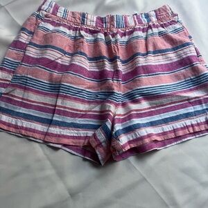 These Joe Fresh Bermudas showcase a vibrant striped pattern in pink, white, blue, and purple, perfect for a relaxed summer vibe. Crafted from lightweight fabric, they feature an elastic waistband for added comfort. Ideal for casual outings, these shorts offer a playful and eye-catching design.