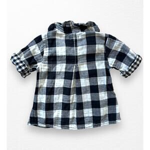 Black and white buffalo plaid tunic top from Joe Fresh in size 4. Features roll-up tab sleeves, a front button yoke, ruffled collar, and contrasting inner plaid lining. Made from slub-knit, textured 100% cotton.
