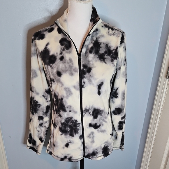 Joe Fresh black and white tie dye pattern zip-up fleece jacket. Side slash pockets. Activewear.
