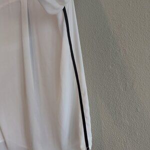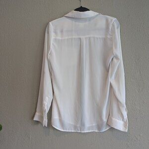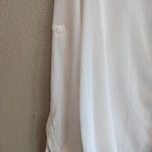 Stylish and versatile Joe Fresh button-down top in size Small. Made of lightweight, wrinkle-resistant 100% polyester—easy to care for and wear. The top is sheer, so you would need to layer underneath. Long sleeves with convertible roll up tabs and button cuffs