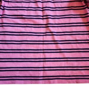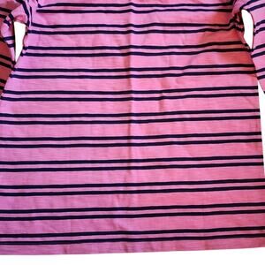 This Joe Fresh Women's Knit Top in size M is a stylish and comfortable addition to any casual outfit. Featuring a pink and navy striped pattern, 3/4 raglan sleeves, and button accents on the shoulder, this top combines a classic crew neck with a pullover closure for easy wear. Made from 100% cotton knit fabric, this top is perfect for all seasons and offers a regular fit for a comfortable and flattering look. Perfect for everyday wear, this Joe Fresh top is a versatile and chic choice for any woman's wardrobe. In very good condition.