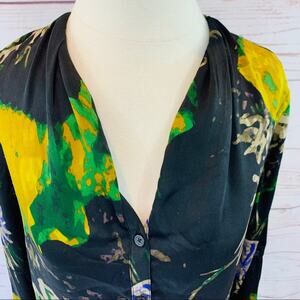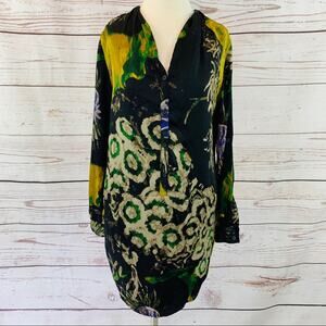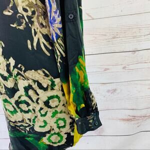 Joe Fresh watercolor design in gold, green, black purple beige. Hidden pockets at sides. Fully lined with sleeve that can be rolled up and buttoned. Size XS