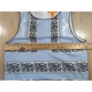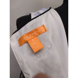 Sleeveless shift dress from Joe Fresh. Lined. Generous back zip. Powder blue with a black lattice look pattern. Minor wash wear on front. No materials tag but other dresses like this are polyester. Size 8.