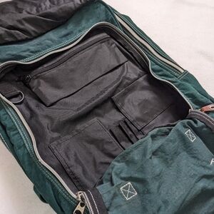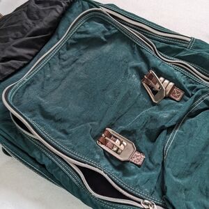 Vintage Joe Husky backpack brought over from Germany. Forest green with black. Has that large European school bag capacity with two large compartments and one smaller one on the front. It is in good condition but subject to some wear. One strap for the small front pocket was patched and some of the faux leather has cracking. Overall functional as the main straps and body have no damage.