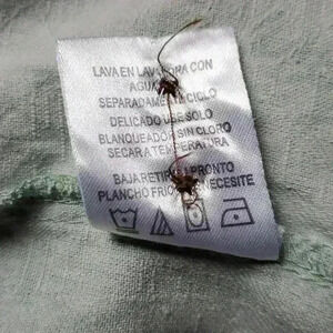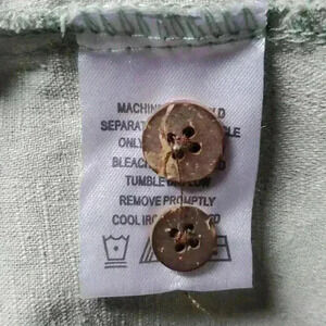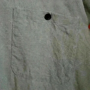 93% silk 4% cotton 3% other fibers material is a sage green color woven with tropical foliage/ floral pattern. Wood buttons. Single pocket on chest.