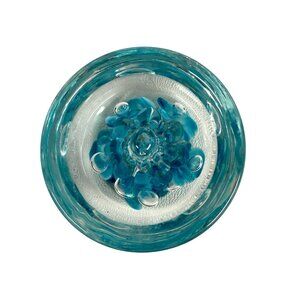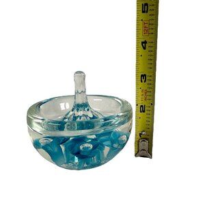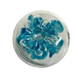 Joe Rice Blue & Clear Glass Ring Holder Paper Weight Flower Design