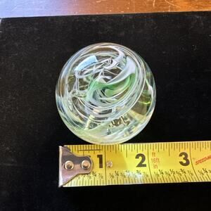 This beautiful paperweight ball is a work of art, expertly crafted by JOE RICE using hand blown glass and featuring a stunning green and white swirl pattern. The unique design and high-quality materials make this a valuable addition to any collection. With its mid-century modern style and vintage originality, makes it a unique addition to a desk or office space. It is also signed by the artist, adding to its authenticity and value. This paperweight is handmade with great care and attention to detail, making it a true masterpiece.