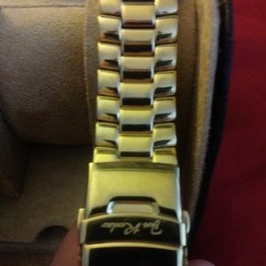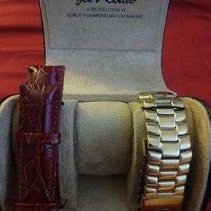 Never used watchbands. One 24mm stainless steel gold and one 24 mm genuine leather deep burgandy. Both brand new in beautifully crafted designer leather and suede display box.