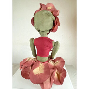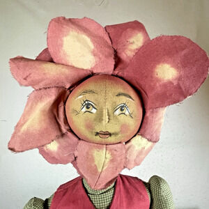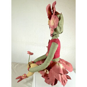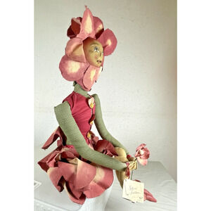 Joe Spencer Gathered Traditions Rose Doll (Named Rosie) Flower Anthropomorphic Folk Art Shelf Sitter. When sitting she is approximately 15 inches tall - she is meant to sit since her legs are permanently bent. Pink dusty rose color. Flower face, skirt and buttons. Circa late 1980s or 1990s. Each of these dolls are handmade by an artisan and are not common. Pre-owned condition. Very dusty from storage....I lightly wiped with a damp cloth, but did not want to damage, so it likely needs a proper cleaning. Her pedals have creases in them and need to be reshaped. She will sit on her on if arms are around knees, otherwise she may need to lean on something. Still has original Joe Spencer tag, which does have some damage. Review photos carefully for measurements and all condition & style details.
