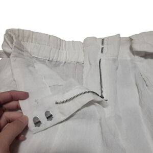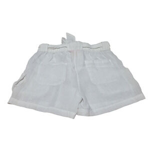 These Joe Fresh semi-sheer white rayon shorts in size 4 offer a breezy, stylish look with plenty of functional details. The large cargo pockets on the front add a utilitarian vibe, while the regular pockets on the back keep things practical. A matching belt made of the same rayon material cinches at the waist for a flattering fit. The hook-and-bar closure keeps the shorts secure, though please note that the button has fallen off; however, the shorts still fasten perfectly without it. These gently used shorts are ideal for warm weather and can be dressed up or down with ease.