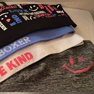 1-Black W/ pink blue white words like “LOCE YOURSELF, LOVE, KOE BOXER, I AM SMART BRAVE STRONG, BE KIND 😉