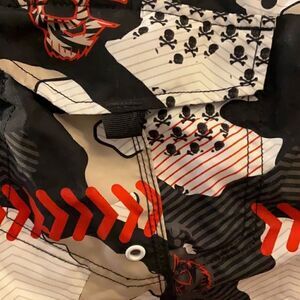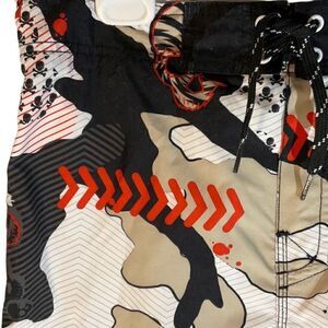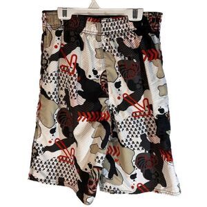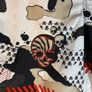 Cool Joe Boxer Boys Size 14H Board Shorts Swim Trunks. Funky pattern of big and little skulls on white and beige background. Lace up front. Mesh lining. Velcro hip pocket. Excellent preloved condition. Like new