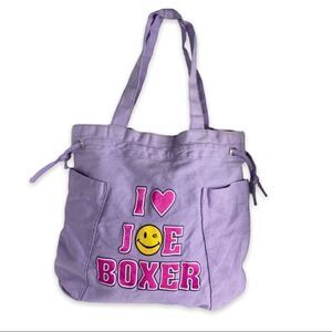 Joe Boxer messenger bag. Purple with pink glitter I Love Joe Boxer in front with a wink emoji. Magnetic snap closure and tie strings on sides. Double pockets on inside.