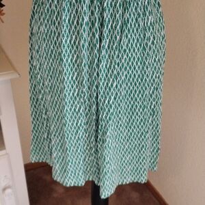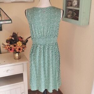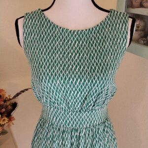 This dress is so cool and " fresh." 🙂. Made of soft rayon knit, there's a lot of movement. Size M measures 38 at chest, 30 at waist, 56 at hips for a full skirt. 36 long from shoulder to hem. Really pretty, comfortable and ready for what ever you want to do.