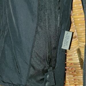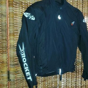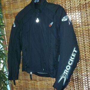 This is a Joe Rocket motorcycle jacket. It has a zip on lower, padding on back, shoulders and lower arms. There is a full zipper up the front, 2 hand zip pockets, 2 lower zippers in back, and 2 inside pockets.