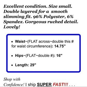 Excellent condition. Size small. Double layered for a smooth slimming fit. 96% Polyester, 6% Spandex. Gorgeous ruched detail. Lovely!