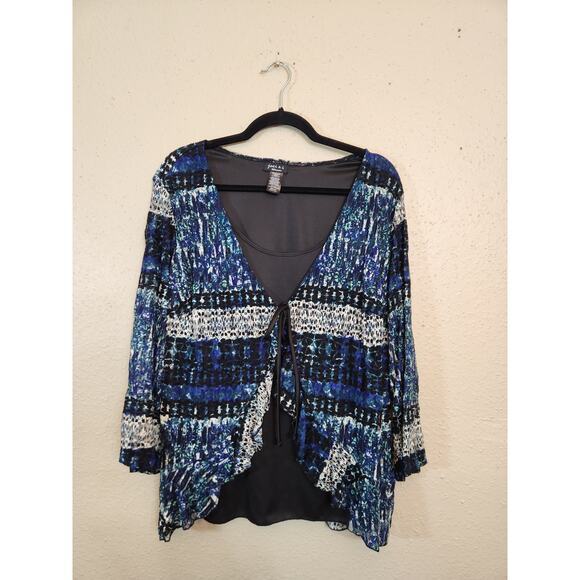 Joei & I Women's Blue Black Stretch V-Neck Tie Front Long Sleeve Blouse Size 2X